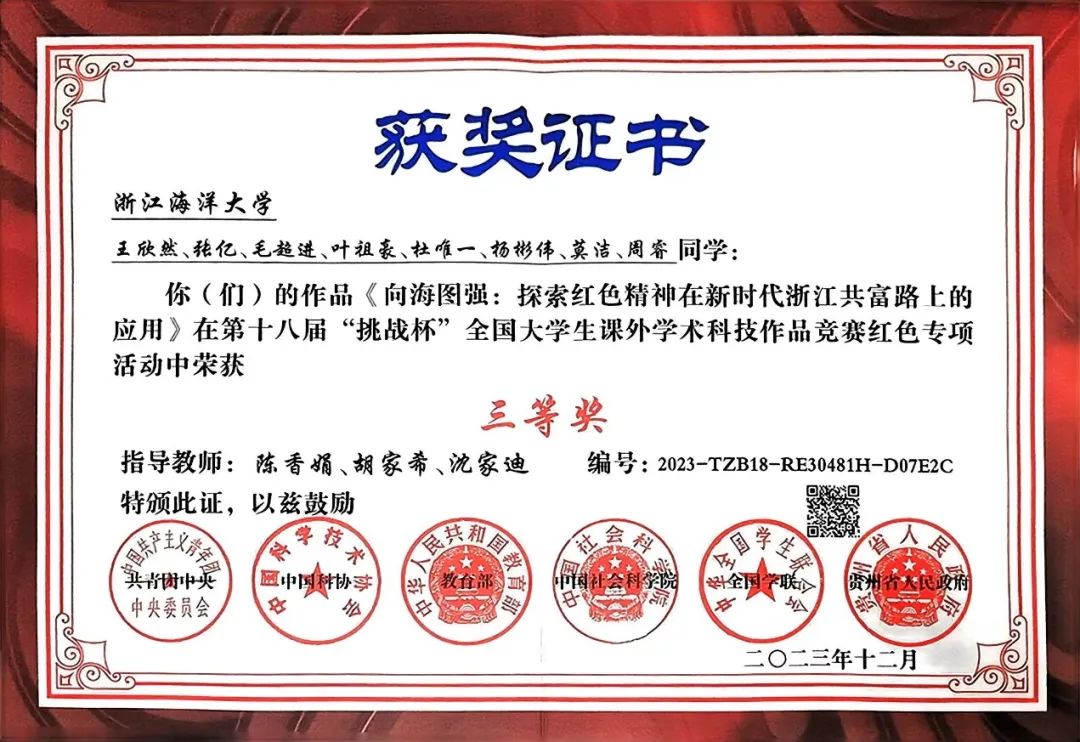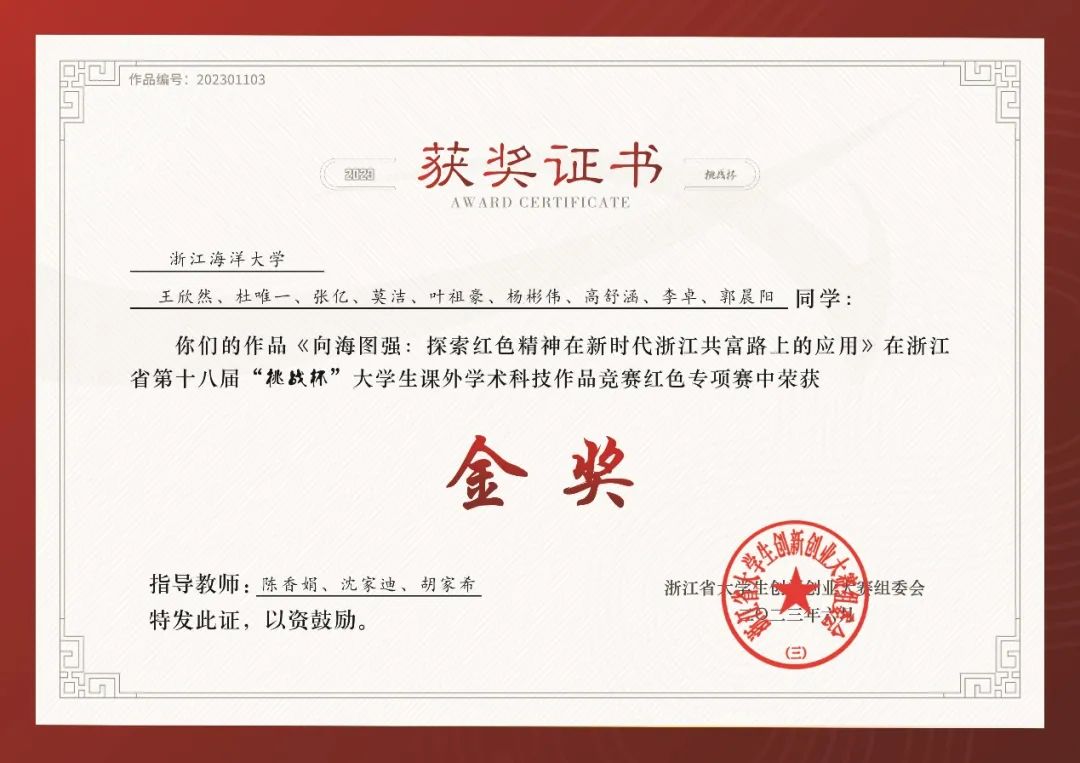 这是该作品自去年6月荣获浙江省第十八届“挑战杯”大学生课外学术科技作品竞赛红色专项赛省赛金奖、12月荣获第十八届“挑战杯”大学生课外学术科技作品竞赛红色专项活动国赛三等奖之后,再一次斩获相关奖项。