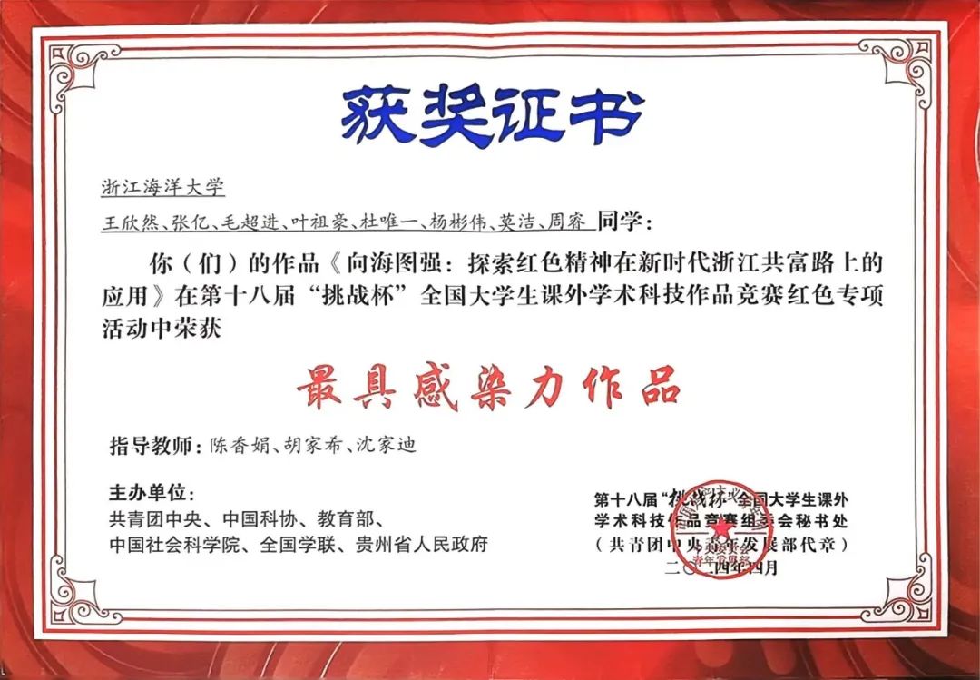 近日,第十八届“挑战杯”全国大学生课外学术科技作品竞赛红色专项活动“最具感染力奖”作品揭晓,大赛组委会遴选出100件“最具感染力奖”作品,由学院A20储运2班王欣然同学作为负责人提交的作品《向海图强:探索红色精神在新时代浙江共富路上的应用》荣获“最具感染力作品”奖项。