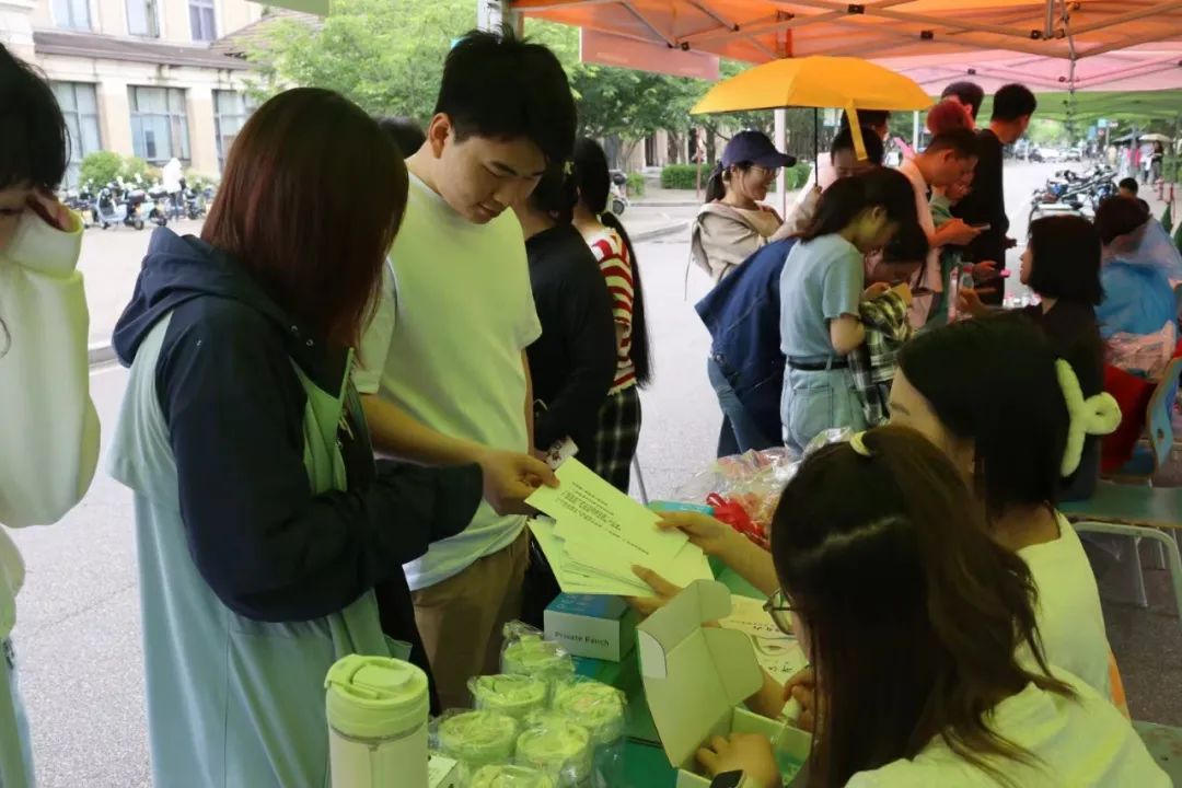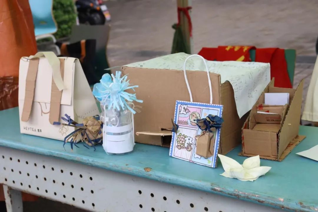 志愿团队设“绿动校园,变废为宝”创意手工展示活动摊位,通过发放垃圾分类宣传单、环保知识答题以及 “变废为宝”手工制作展示等方式,向参与活动的师生普及环境保护以及垃圾分类相关知识。“垃圾是放错了地方的资源”,参与活动的师生通过画、折、剪、贴等多种方法把饮料瓶、铁丝、泡沫、旧布料、旧报纸、树叶、毛线、树根等各种废旧品制作成各式各样的精美作品,如精美的花球、书包、机支架、脚踏垃圾桶等,并在摊位进行展出,将环保与创新融合,使旧物焕发新生。