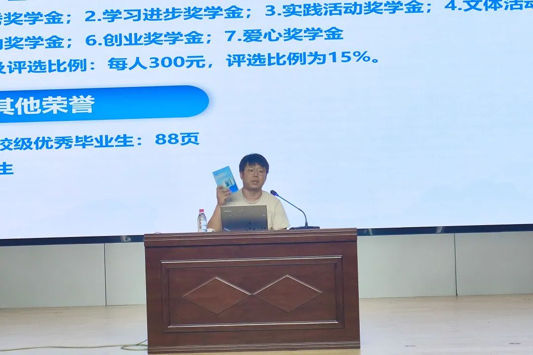 随后,赵子龙老师介绍各类奖学金申报流程和条件,鼓励新生们积极进取,努力学习,争取参评奖学金;另外,赵老师从处分种类、违纪行为和处理、处分程序等几方面介绍了学生违纪行为处理规定;最后,赵老师还从创新创业学分的含义、具体要求以及具体内容等方面介绍了创新创业学分。