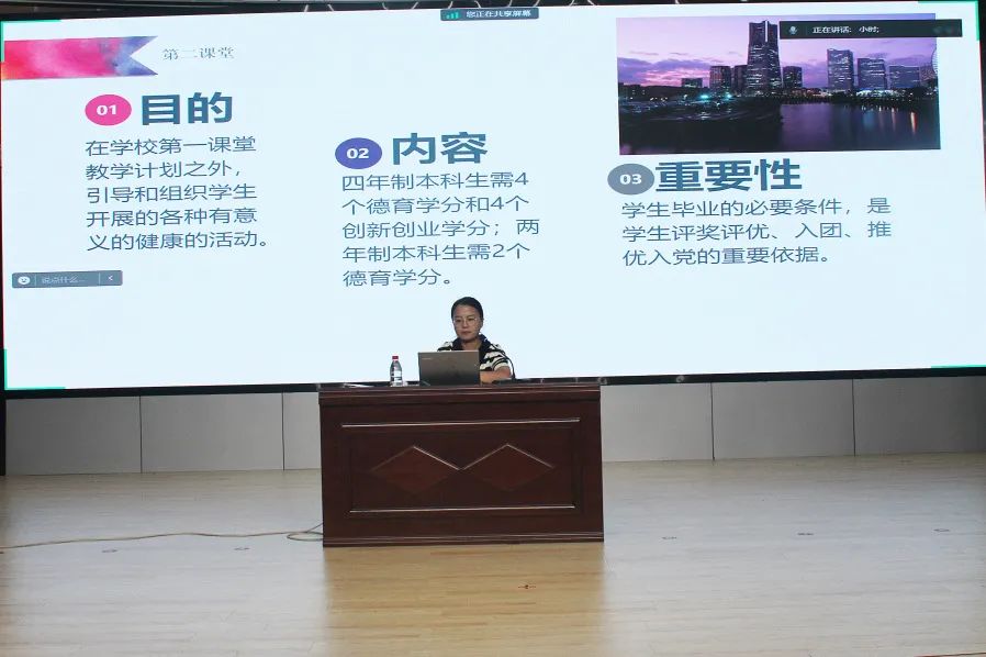 时文苑老师从第二课堂的内涵、德育学分认定、德育课程模块和德育学时的提醒与警示等四方面介绍了第二课堂学习,提醒同学们第二课堂学分是学生毕业的必要条件,是学生评奖评优、入团、推优入党的重要依据,希望大家在规定的基本学制内完成。
