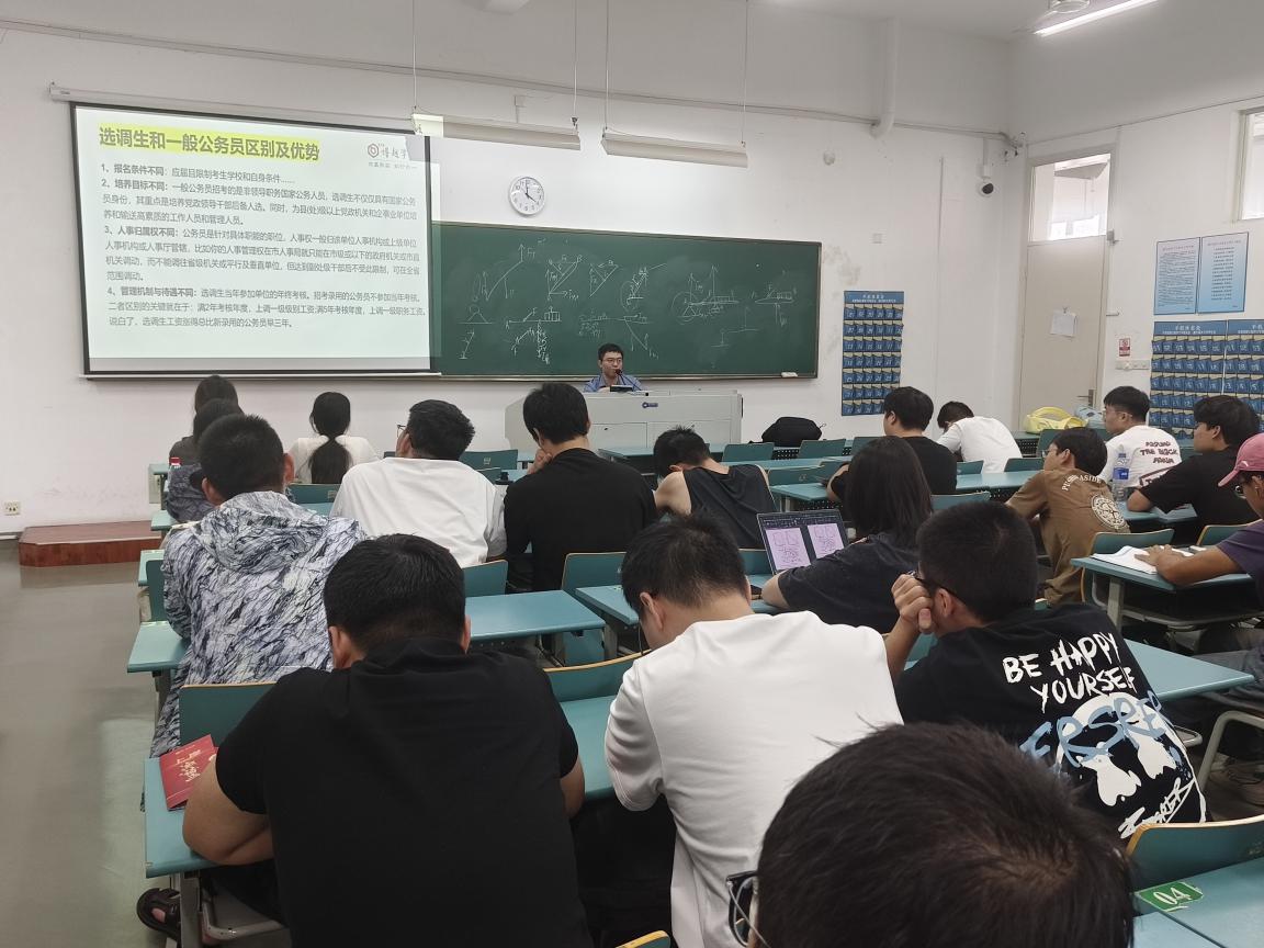 随后,陈老师从“就业与考公”“未来发展规划”“考试内容与考情”“报名流程与选岗技巧”四个核心维度,为同学们拆解毕业后的多元发展路径。针对即将毕业的学生,他精准梳理了大学生考公的先天优势与岗位待遇体系,同时对考研方向及其他就业选择进行客观分析,帮助大家拓宽职业视野。在考公实操指导环节,陈老师详细解读了考试科目、关键时间节点、笔试与面试的核心考察要点,并特别强调了应届毕业生身份在报考中的独特价值,鼓励同学们结合自身情况积极筹备、勇敢尝试。