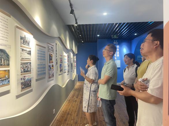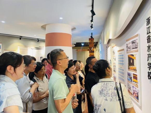 随后,在学校老师的陪同下,校友们步入承载着学校历史记忆的图书馆。在二楼的校史馆,时光的卷轴缓缓展开。一幅幅珍贵的照片、一件件厚重的实物、一段段详实的文字,生动再现了母校从舟山商校到浙江海洋大学的发展足迹与辉煌成就。校友们驻足凝视,仿佛穿越回三十年前的青葱岁月,重温当年的求学时光,更深刻感受到母校日新月异的沧桑巨变和蓬勃发展的强劲脉搏。讲解员细致的解说,勾起了校友们无限的追忆与共鸣,感慨万千。