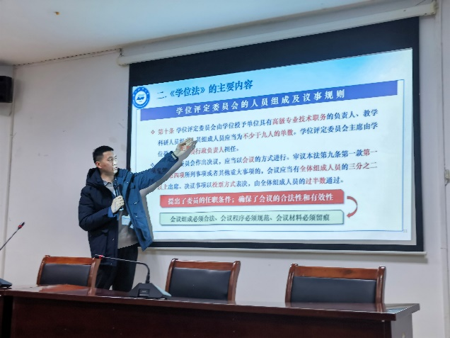 宣讲会上,王路辉副院长从新《学位法》的修订背景、立法宗旨和重大意义切入,结合教育部及学校相关文件精神,系统解读了法律中关于学位授予标准、质量保障体系、学术不端行为处理等核心条款。他强调,新《学位法》是新时代高等教育高质量发展的法律基石,全院教职工需以“立德树人”为根本,强化“质量意识”,严格规范学位论文全过程管理,切实保障学位授予的严肃性与权威性。同时,他结合学院我院学科特点,指出要立足国家能源安全与绿色低碳发展需求,优化学位评价标准,推动分类培养模式创新。